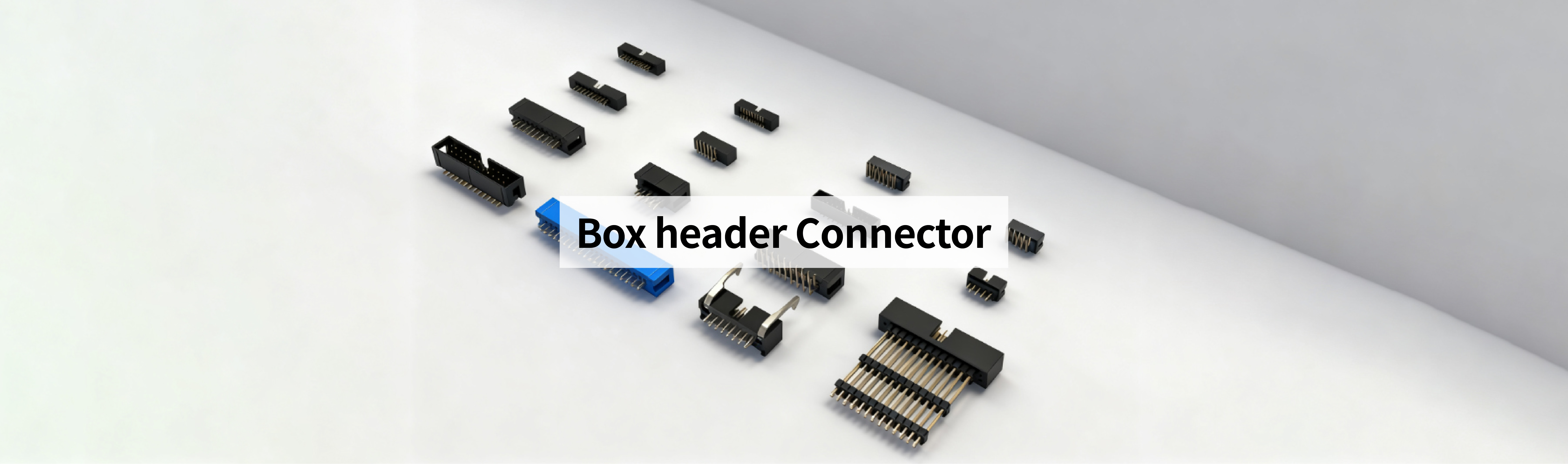 The box header connector transmits control signals and weak currents. It has a square plastic socket & multi-row square pins (no side latches, different from standard box headers), with pin diameter varying by pitch. Its bottom supports SMT or DIP mounting; after soldering, it connects IDC cables for signal transmission.